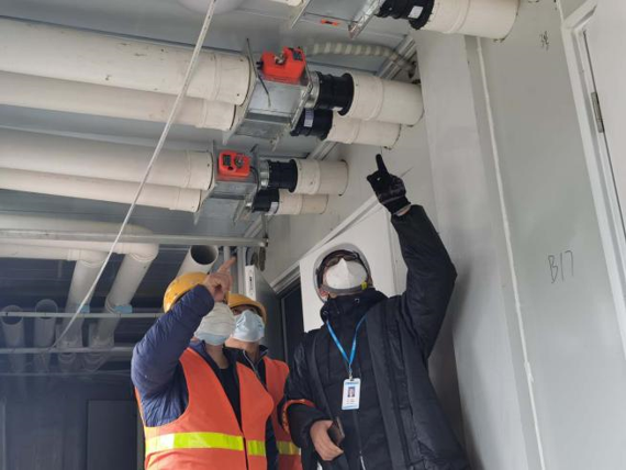 在如火如荼的施工现场,疲惫的身影略显憔悴,为保障隔离区通风系统施工质量,他亲自带领工人逐一排查各类通风分支系统,测试病房风压,确保隔离病房内外空气有效过滤,避免后期交叉感染,