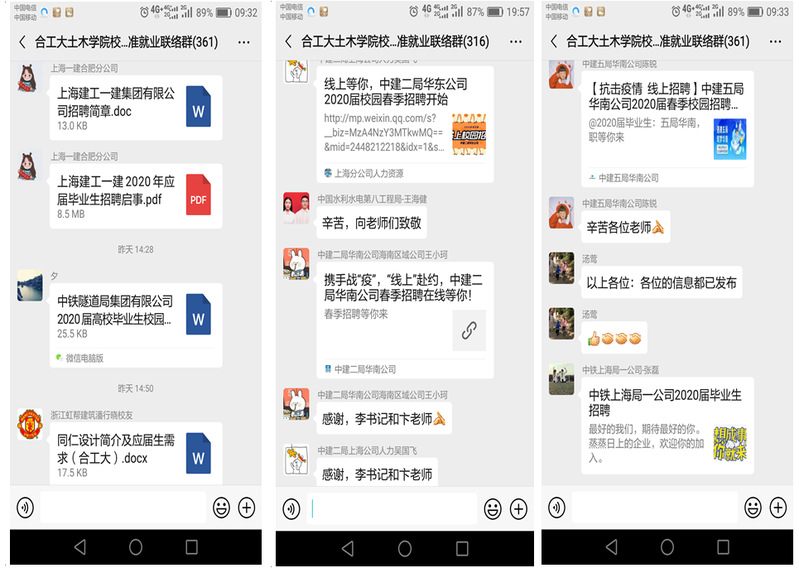 “通过这个校企网上联络群,学校的政策了解的更及时了,我们的需求也可以更好的对接了,非常的方便快捷”,这是武汉雷神山医院承建单位中建三局一公司校园招聘程经理对校企联络群评价。面对新冠肺炎疫情,best365中国官方网站积极响应学校就业工作要求,充分利用互联网优势,将疫情防控和促进精准就业有机结合,开展形式多样的网上就业指导服务活动,构建全方位的就业信息服务体系。