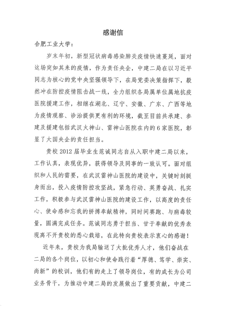 贵校2012届毕业生范诚同志自从入职中建二局以来,工作认真,表现优异,获得领导及同事的一致认可。面对组织和人民的需要,在武汉雷神山医院的建设中,关键时刻挺身而出,投入疫情防控攻坚战,紧急行动、英勇奋战、扎实工作,积极参与武汉雷神山医院的建设工作,以高度的责任心、使命感和忘我的拼搏奉献精神,同时间赛跑、与病毒较量,圆满完成任务。范诚同志勇于担当、甘于奉献的优秀表现离不开贵校的悉心栽培,在此特向贵校表示衷心的感谢!