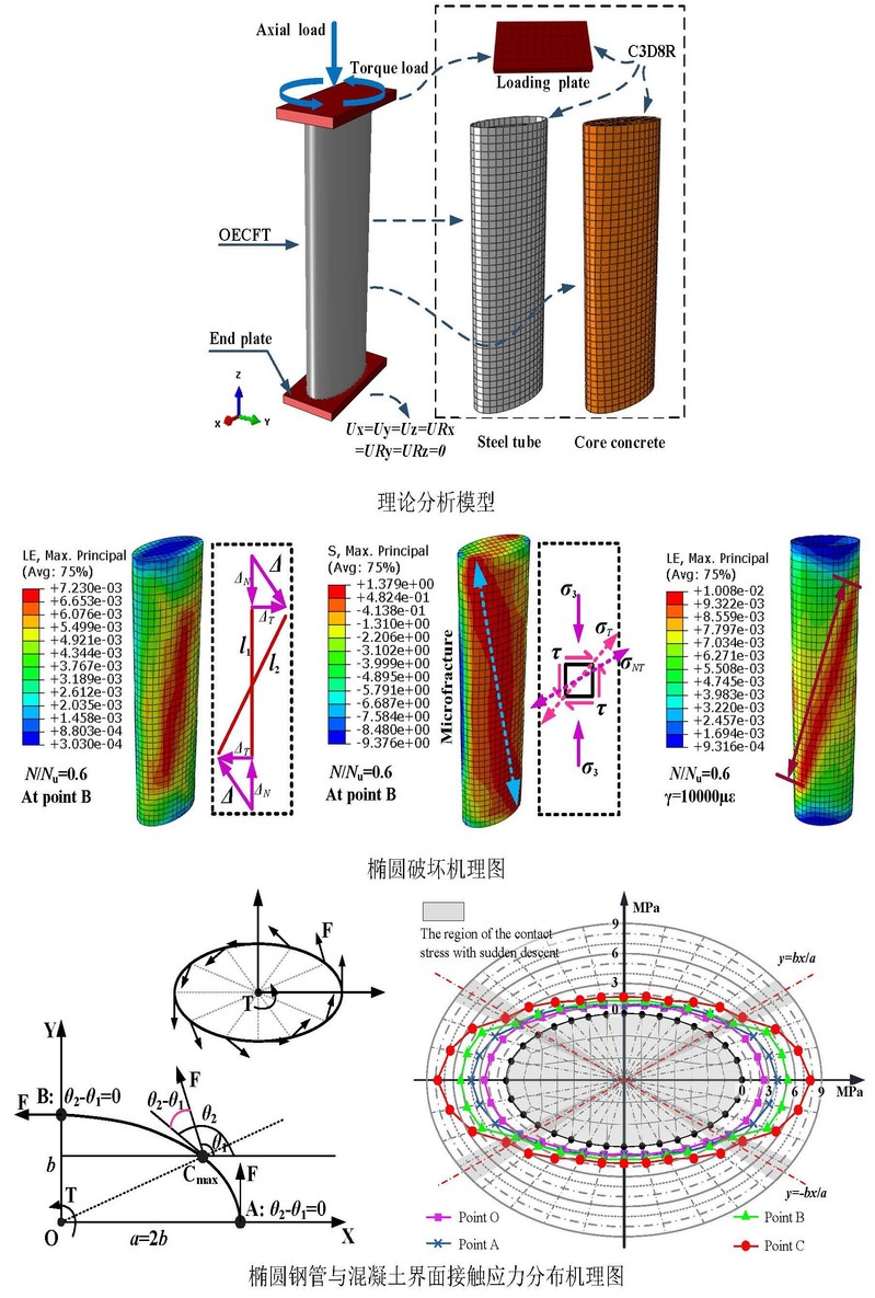 王静峰教授课题组历经十年,对圆端形、尖端形椭圆钢管混凝土系统进行了单一、复合静力荷载下的试验和理论研究,建立了考虑椭圆截面特征和约束状态分区影响的核心混凝土等效本构模型,揭示了椭圆钢管混凝土的损坏特征、传力机制和界面机理等,发现了诸多参数对其承载性能的影响规律;提出了椭圆钢管混凝土受压、受弯、受剪、受扭和压弯扭剪承载力计算理论。