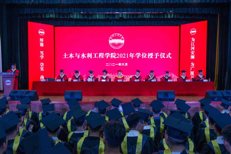 仪式上,学院学位委员会主席、常务副院长王静峰教授宣读《关于授予土木与水利工程工程学院2021年毕业生学位的决定》,授予王志龙等518名本科生工学学士学位,授予李金超等3名博士研究生学术博士学位,授予江鹏等100名硕士研究生全日制学术硕士学位,授予汤子祥等126名硕士研究生全日制专业硕士学位,授予王凯军等8名硕士研究生非全日制专业硕士学位。仪式为全体学位获得者颁发学位证书,并扶正流苏。