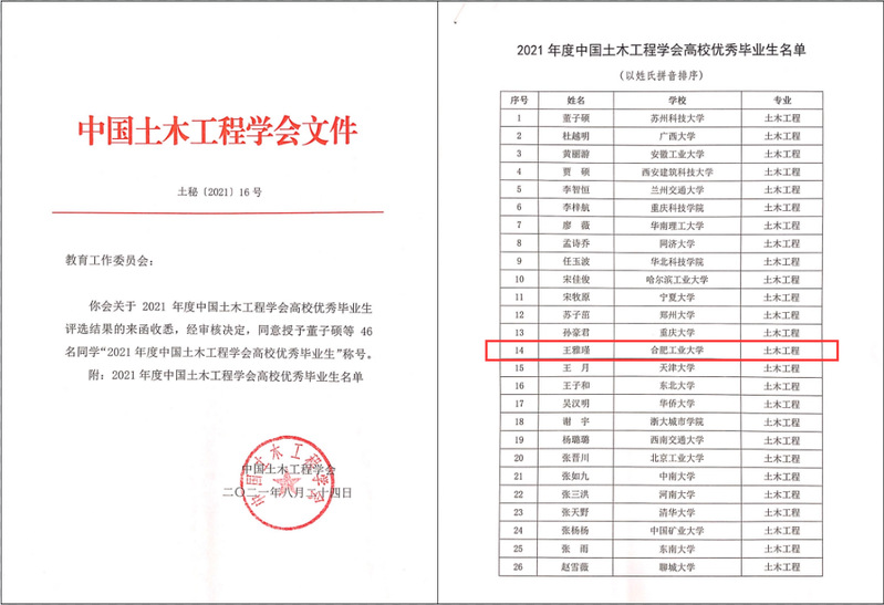 8月24日,由中国土木工程学会举办的2021年度中国土木工程学会高校优秀毕业生评选活动落下帷幕,best365官网2017级土木工程专业王雅瑾同学荣获“2021年度中国土木工程学会高校优秀毕业生”(全国共46名)。