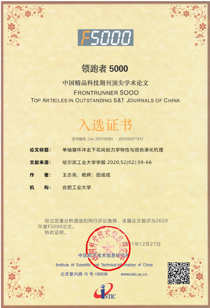 近日,中国科学技术信息研究所(简称中信所)公布了2020年度“领跑者5000——中国精品科技期刊顶尖论文(F5000)”名单,best365官网王志亮教授课题组发表论文《单轴循环冲击下花岗岩力学特性与损伤演化机理》获此殊荣。