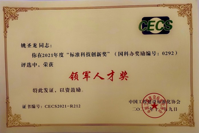 近日,中国工程建设标准化协会在山东省济南市召开标准科技创新奖颁奖大会。会上公布了2021年中国工程建设标准科技创新奖的项目奖、组织奖和人才奖获奖名单。我校兼职教授姚圣龙荣获2021标准科技创新奖领军人才奖。