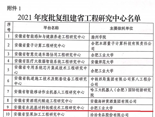 best365官网获批安徽省水泥基材料低碳技术工程研究中心