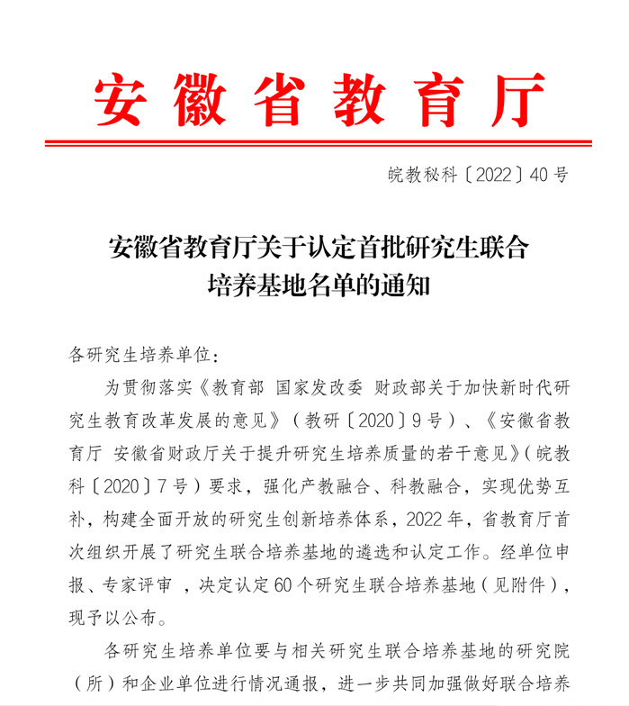 近日,安徽省教育厅组织开展了省级研究生联合培养基地的遴选和认定工作,经单位申报、专家评审,最终遴选出60个首批省级研究生联合培养基地(皖教秘科〔2022〕40号)。best365官网联合安徽省路港工程有限责任公司、安徽富煌钢构股份有限公司申报了省级研究生联合培养基地,均成功入选。