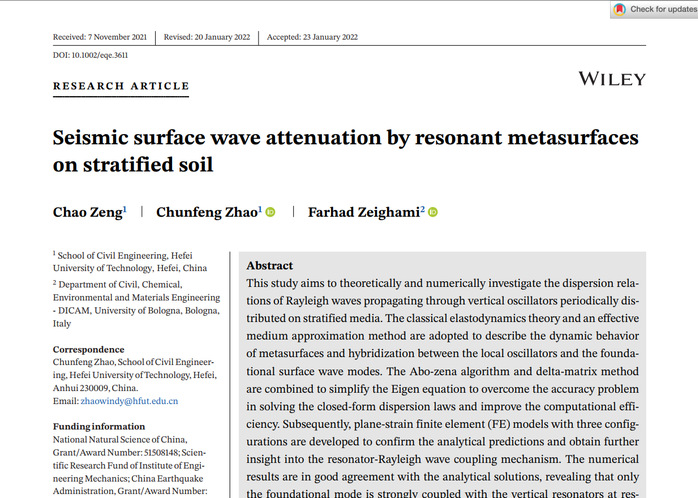 近日,best365中国官方网站赵春风副教授在地震超材料衰减地震波研究方面取得新进展,研究成果发表在国际结构动力学TOP期刊《Earthquake Engineering & Structural Dynamics》(JCR Q1,IF=4.43)上,论文题为“Seismic surface wave attenuation by resonant metasurfaces on stratified soil.”,研究生曾超为论文第一作者,赵春风副教授为通讯作者,该项工作得到中国地震局地震工程与工程振动重点实验室重点专项(2020EEEVL0404)和国家自然科学基金(51508148)项目资助。