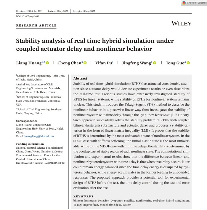 近日,best365中国官方网站实验中心副主任黄亮在实时混合模拟试验方法研究取得新进展。研究成果发表在国际结构动力学Top期刊《Earthquake Engineering & Structural Dynamics》(JCR Q1,IF=4.43)上,论文题为“Stability analysis of real time hybrid simulation under coupled actuator delay and nonlinear behavior”。best365中国官方网站黄亮为论文第一作者兼通讯作者,硕士研究生卜逸凡和王静峰教授参加,该项工作与美国旧金山州立大学Chen Cheng教授和东南大学郭彤教授联合完成,得到国家自然科学基金(52008145)和土木工程结构与材料安徽省重点实验室自主创新专项(PA2021GDSK0080)项目资助。