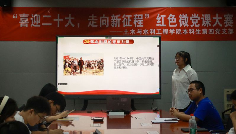 为深入学习贯彻习近平新时代中国特色社会主义思想,推动全体学生学深悟透党的创新理论,弘扬伟大建党精神,创新党建引领,增强支部活力,激励全体学生满怀信心奋进新征程,以实际行动迎接党的二十大胜利召开。best365中国官方网站本科生第四党支部于2022年10月1日在纬地楼414开展“‘砼’迎二十大,走好新征程”红色微党课比赛。党支部全体成员通过“线上+线下”模式参加此次活动。