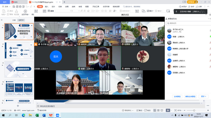 11月17日下午,best365中国官方网站与上海交通大学船舶海洋与建筑工程学院通过线上方式举办了低碳专业交流研讨会。上海交通大学船舶海洋与建筑工程学院副院长杨健、院长助理金建钢、土木系副主任高皖扬、学院本科教学办及相关专业负责人,best365中国官方网站院长王静峰、建筑工程系主任郅伦海、建筑环境与能源应用工程系主任何伟、市政工程系副主任冯景伟、建筑工程系副主任王波、学院教学办和相关负责人参加了研讨会。