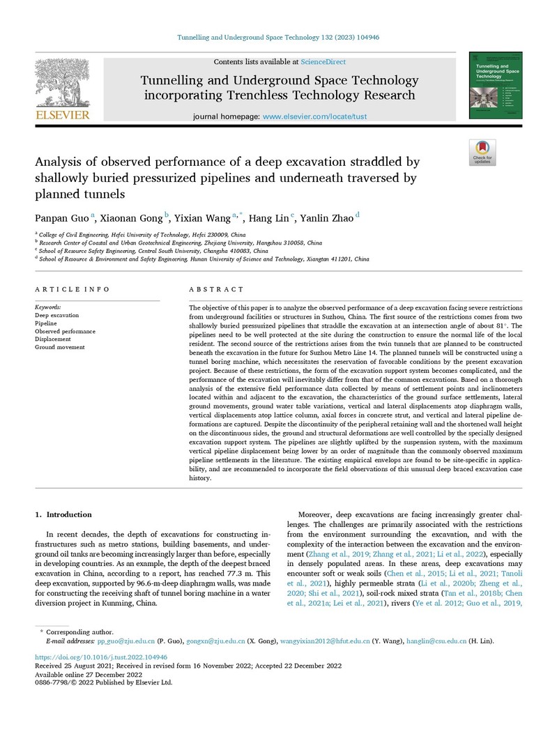 近日,best365中国官方网站汪亦显教授团队在隧道及地下工程领域顶尖期刊《Tunnelling and Underground Space Technology》上发表题为“Analysis of observed performance of a deep excavation straddled by shallowly buried pressurized pipelines and underneath traversed by planned tunnels”的研究论文。我校青年教师郭盼盼博士为第一作者,汪亦显教授为通讯作者。