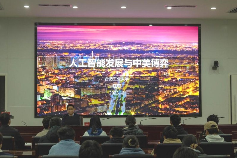 汪萌校长由人工智能的发展引入,向参会师生解析了国际局势复杂多变、风高浪急的形势,强调当今世界正经历百年未有之大变局。接着带领大家认真学习国家《新一代人工智能发展规划》和《安徽省通用人工智能产业创新发展三年行动计划(2023—2025年)》文件精神,引导师生们深入思考人工智能发展对国际局势的影响,以及如何在新一轮的科技革命和产业变革中抓住机遇,为推动国家科技创新和社会进步做出贡献。