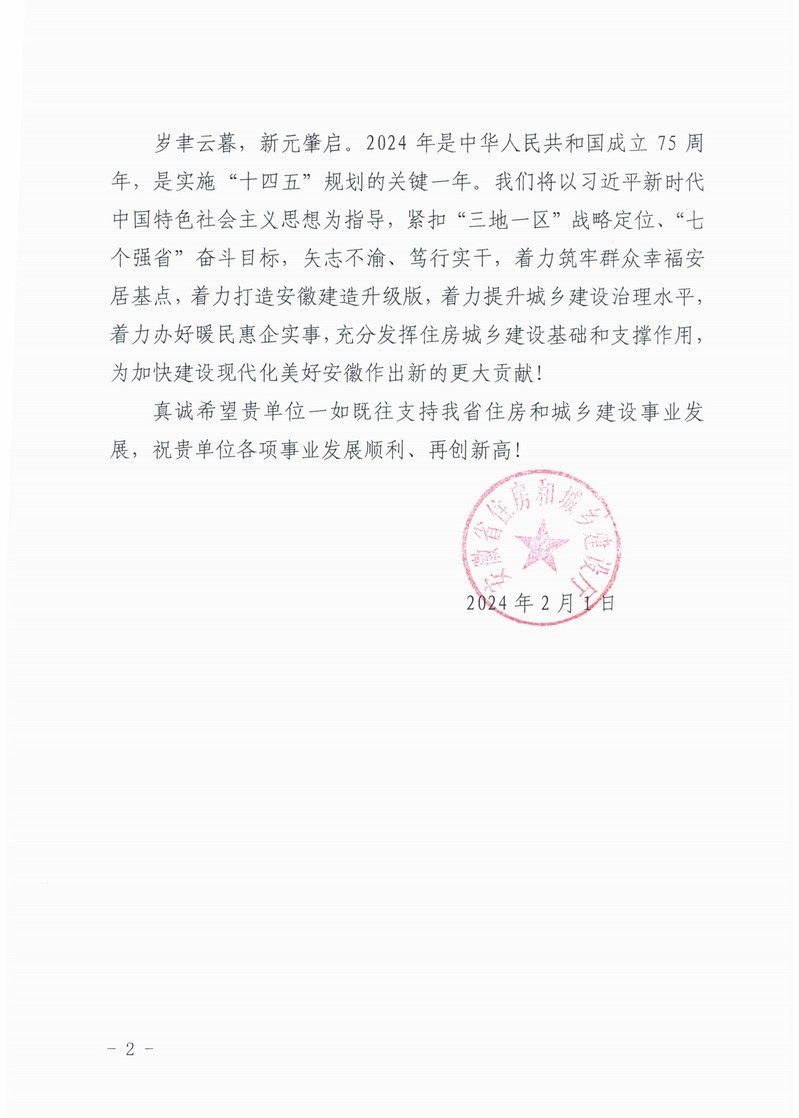 春节即将来临之际,best365官网收到来自安徽省住房和城乡建设厅的感谢信,对best365官网过去一年在推动安徽省城乡建设绿色建筑发展、建筑领域低碳发展做出的突出贡献以及展现出的优良作风,给予了高度肯定和赞扬。