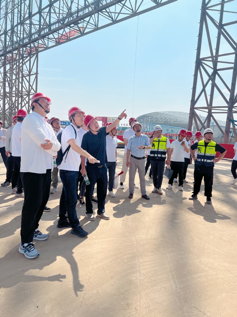 项目总工程师童敏热情地接待了师生。研究生们参观了钢结构构件的进场、拼装焊接及吊装的各个流程,还乘坐垂直电梯登上了已成功拼装的钢结构屋盖网架,亲身体验了“一根根格构柱拔地而起,一榀榀桁架横跨苍穹”的视觉盛宴。大家不觉赞叹,在这令人震撼的工程奇迹背后,凝聚的是所有工程参与者的辛勤劳动和智慧结晶,他们攻坚克难,解决接连不断的困难与障碍,将新型技术与传统土木领域进行有机结合,才有了今天国之重器的雏形。