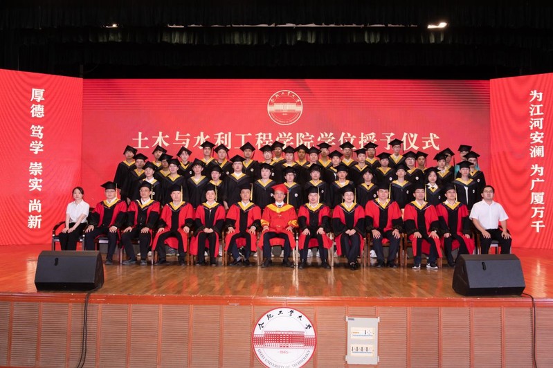 全体与会授学位者为学位获得者颁发了学位证书、扶正流苏并合影留念。