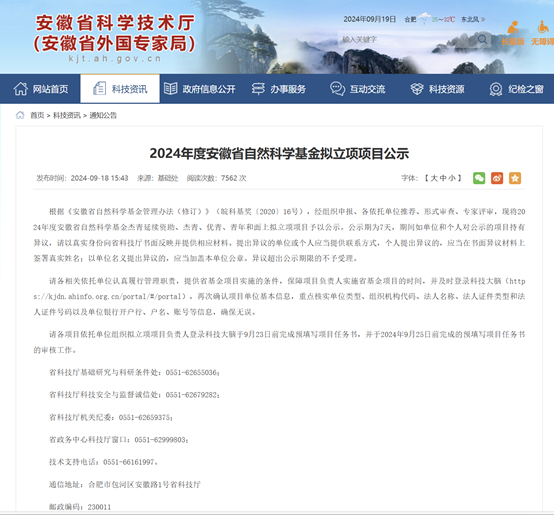 根据安徽省科学技术厅的2024年度安徽省自然科学基金杰青、优青、青年和面上拟立项项目公示,best365官网获批安徽省自然科学基金10项,其中杰青项目1项,面上项目7项,青年项目2项。