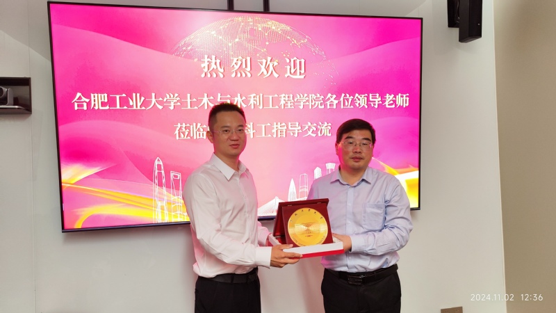 王东坡书记介绍了学校与学院的发展历程与取得的成就,同时学院育人成果丰硕,桃李遍布安徽省乃至全国各行各业,希望能与优秀校友及企业不断加强交流合作,并向科工及校友发出邀请,参加学院80周年庆活动,共商学院未来发展。王静峰院长对中建科工集团的人才战略与产业发展表示了肯定,对陈磊校友的热情接待表示了感谢。他指出希望双方加强科研合作,尤其是土木工程智能化相关板块等;在校企育人方面加强合作,加大优秀毕业生输送,开展研究生校企共同培养探索;双方共同开展培训赋能,为企业培养提升人才队伍建设;特别是目前学院的发展方向与中建科工的主营创新业务契合度很高,在科研合作,业务协同和成果转化方面有着良好的合作前景。