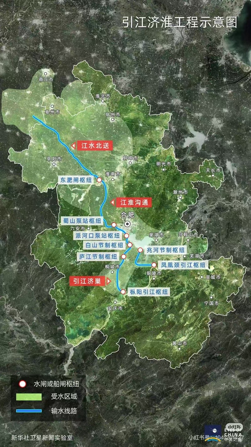 引江济淮工程是一项以城乡供水和发展江淮航运为主,结合灌溉补水和改善巢湖及淮河水生态环境为主要任务的大型跨流域调水工程。自南向北分为引江济巢、江淮沟通、江水北送三段,输水线路总长723公里,其中新开河渠88.7公里、利用现有河湖311.6公里、疏浚扩挖215.6公里、压力管道107.1公里。