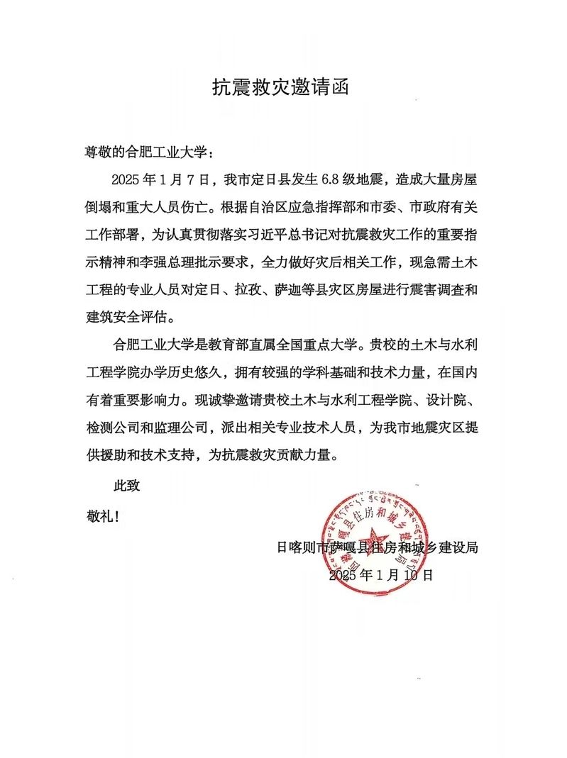 1月10日,因定日、拉孜、萨迦等灾区房屋受损严重,亟需专业技术人员进行震害调查和建筑安全评估,日喀则市住房和城乡建设局发函邀请学院组织相关专业技术人员,为日喀则市地震灾区提供援助和技术支持。