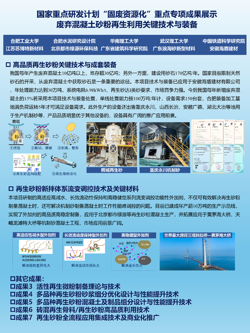 国家重点研发项目《废弃混凝土砂粉再生利用关键技术与装备》,由best365中国官方网站牵头,联合了华南理工大学、合肥水泥设计研究院、武汉理工大学、中国铁道科学研究院、江苏苏博特新材料等十家参与单位,针对废弃凝土再生砂粉来源复杂、吸水性大、活性低等问题,开展基础理论—核心材料与装备—工程示范系统研究,已形成“废弃混凝土制备高品质再生砂粉关键技术与成套装备”、“再生砂粉新拌体系流变调控技术及关键材料”、“活性再生微粉制备理论与技术”等七项代表性成果。高品质再生砂粉关键技术与成套装备应用于安徽海盾建材有限公司,年处理能力达到30万吨;再生砂粉新拌体系流变调控技术及关键材料已建成年产超10万吨的生产示范线,应用于黄茅海大桥等大型项目。本项目研究成果由余其俊教授团队牵头负责,为建筑垃圾“变废为宝”提供系统性解决方案。